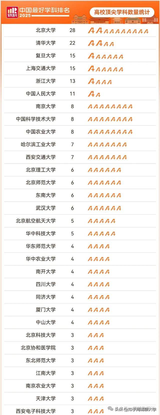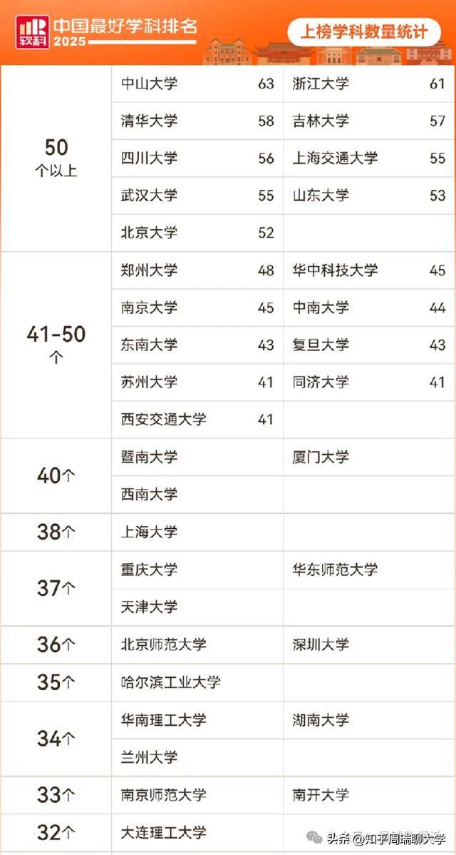 浙江大学(61个)、四川大学(56个)、武汉大学(55个)、上海交通大学(55个)等校紧随其后,上榜学科均跨越50个。大学、大学等校也正在 50 个上榜学科以上,它们的 “学科邦畿” 同样广漠。这折射出一个清晰的纪律:分析性研究型大学要正在学科排名中连结劣势,必需走 “全面开花” 的线。丰硕的学科门类不只能推进交叉研究(如医工连系、文理交叉),还能正在人才培育上实现 “通专连系”,中山大学的成功,恰是这种 “分析线” 的典型,它证了然高校能够通过持续的学科扩张取升级,建立起强大的学科生态,正在 “数量” 取 “质量” 的双沉维度上占领自动。