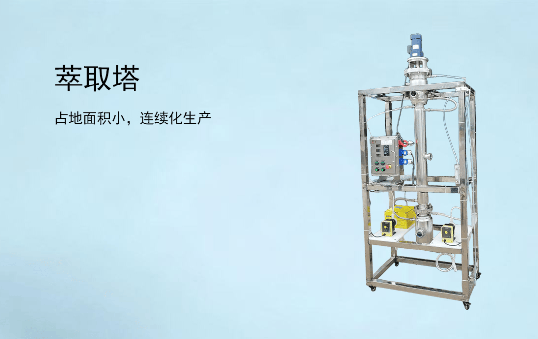 塔式萃取设备具有占地面积小、处置能力大、 密闭机能好等特点,按照分手要求,处置能力和系统特征的分歧可设想成分歧的布局。