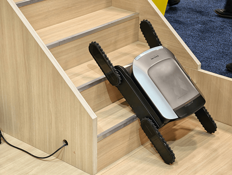 我们还正在现场看到了曾正在客岁IFA表态过的爬楼机Cyber X,和上一次比拟,它的机能又有了一些新升级。现正在它能爬上最高35cm的台阶,挪动速度也做到了最快0。2m/s,爬一层楼只需要27秒。它特有的三段式履带对于楼梯的顺应性很强,曲梯、弧形梯等等楼梯都能够流利攀爬,可攀爬坡度也达到了42°。
